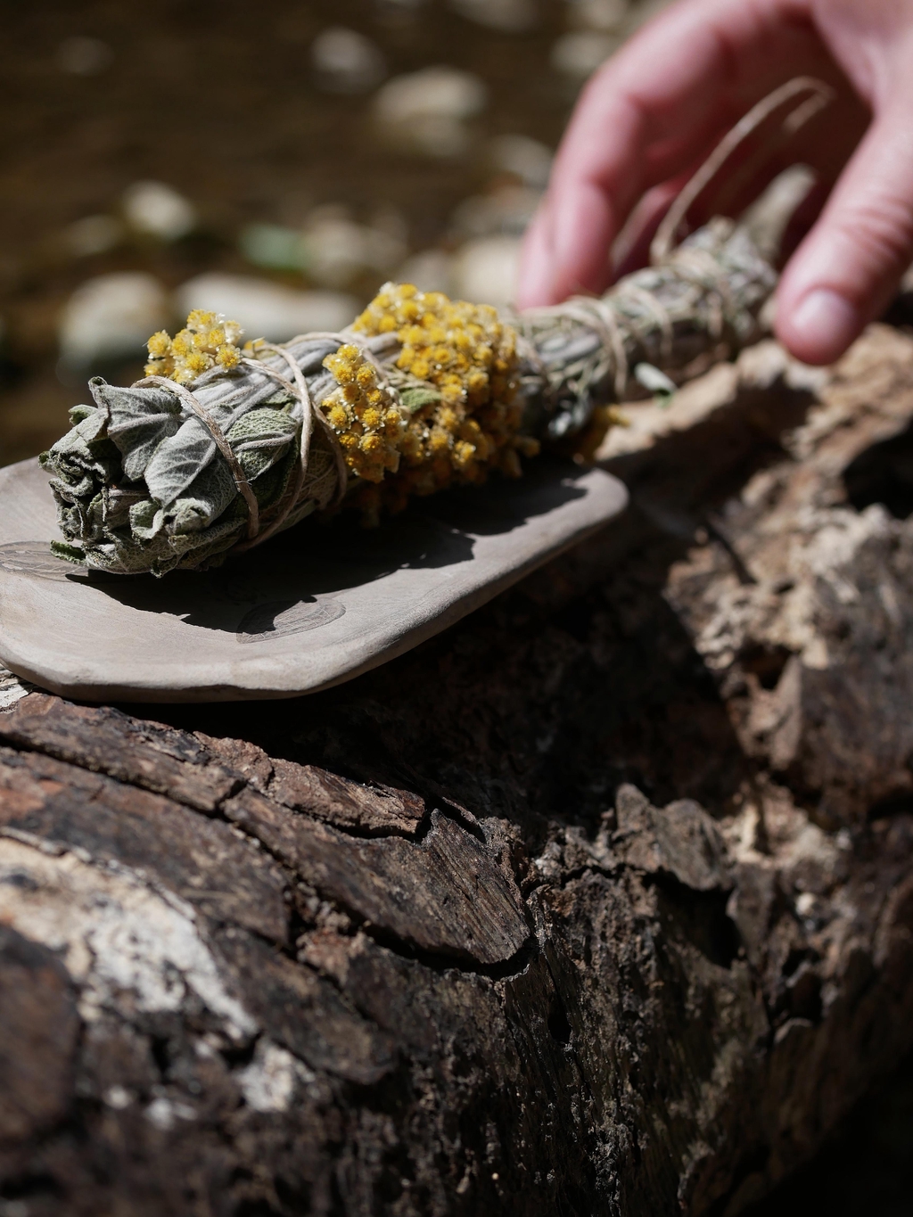 Un assortiment de 3 bâtons de fumigation confectionnés à la main avec uniquement des plantes du jardin d’Alice, permacultivées sans aucun traitement.